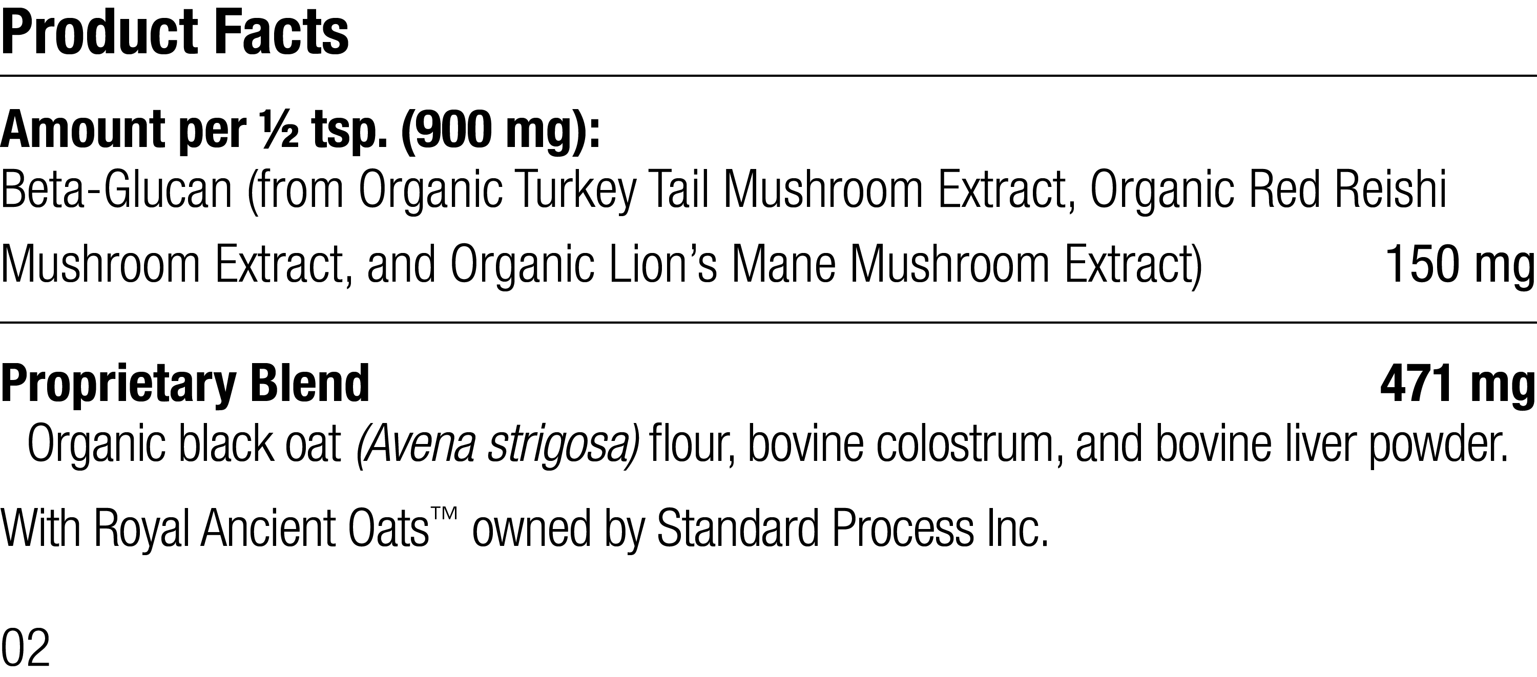 Mushroom Complex contains two ingredients which provide beta-glucans: a blend of three powdered mushrooms, and a unique strain of oats derived from wild ancient variants.
